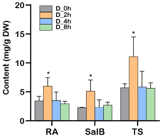 Phenolic acid content in drought-treated S. miltiorrhiza plants at 0, 2, 4, 8h. D_0h, drought treatment for 0h (before treatment); D_2h, drought treatment for 2h; D_4h, drought treatment for 4h; D_8h, drought treatment for 8h. RA, rosmarinic acid; Sal B, salvianolic acid B; TS, total phenolic acids. Error bars indicate SD (n = 3), * p < 0.05.