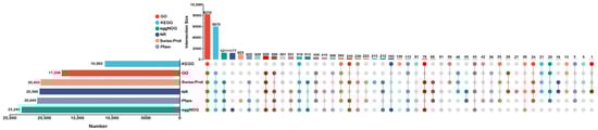 Of the total unigenes, 47,169 were successfully annotated in at least one of the six publicly available protein databases. The annotations were distributed as follows: 17,336 unigenes (36.75%) were annotated in the Gene Ontology (GO) database, 10,992 in the KEGG database, 23,243 in the eggnog database, 20,590 in the NCBI protein non-redundant (NR) database, 20,433 in the Swiss-Prot database and 20,945 in the Pfam database (Table 3). Notably, 8210 unigenes displayed significant matches across all six databases, reflecting comprehensive annotation coverage. In addition, the number of unigenes that were individually annotated into these databases differed, such as 1177 in COG and 0 in GO (Figure 2).