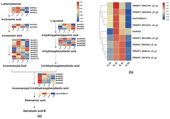 Expression profile of selected unigenes. (a) Expression of key enzyme genes in the biosynthetic pathway of phenolic acids. The expression levels of biosynthetic genes at different times of drought treatment were presented in a heatmap using line normalization criteria. FPKM values of unigenes were transformed by log2. The redder the color, the higher the expression level, and the bluer the color, the lower the expression level. (b) Correlation expression profile of selected laccases with SmRAS1 and SmCYP98A14. After FPKM normalization, 7 of the 50 unigenes annotated as LAC were found to have similar expression trends to SmRAS1 and SmCYP98A14.