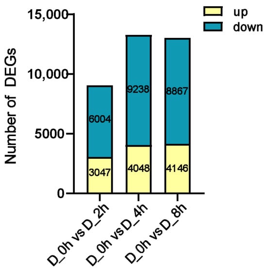 To investigate the impact of drought stress on S. miltiorrhiza at different time points, differential expressed genes (DEGs) were identified. Compared to the control group, a total of 9051 unigenes exhibited differential expression in response to drought stress at 2h, with 3047 up-regulated genes and 6004 down-regulated genes. Similarly, at 4h, 13,286 unigenes showed differential expression, with 4048 up-regulated genes and 9238 down-regulated genes. Drought stress at 8h resulted in the differential expression of 13,013 unigenes, with 4146 up-regulated genes and 8867 down-regulated genes. Notably, the highest number of DEGs (13,286) appeared in the drought-0h-vs.-drought-4h group. However, the largest number of up-regulated genes (4146) was found in the drought-0h versus drought-8h comparison (Figure 4).