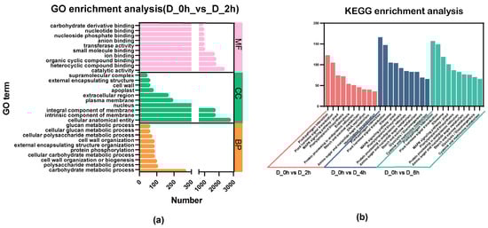 Functional enrichment analysis of DGEs. (a) GO enrichment analysis of DEGs in D_0h vs. D_2h. The ordinate indicates the GO term, and the abscissa indicates the number of enrichments. The top 10 terms with the largest number from MF (molecular function), BP (biological process) and CC (cellular component), respectively, were selected for display. (b) KEGG enrichment analysis of DEGs under drought treatment. Red, D_0h vs. D_2h; blue, D_0h vs. D_4h; green, D_0h vs. D_8h.