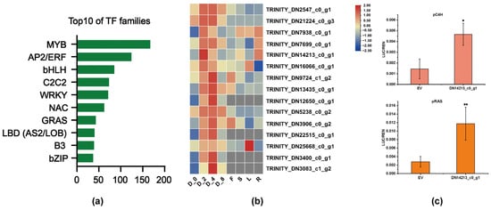 Analysis of DEGs annotated as TFs. (a) The top 10 TF families with more than 35 members were listed. (b) Expression profile of 15 TFs in different drought treatments and different tissues in S. miltiorrhiza. D_0h, D_2h, D_4h and D_8h represented drought treatment at 0h, 2h, 4h and 8h, respectively. F, flower; S, stem; L, leaf; R, root. FPKM values of unigenes were transformed by log2. The redder the color, the higher the expression level, and the bluer the color, the lower the expression level. (c) Dual-luc analysis showing that DN14213_c0_g1 activated SmC4H and SmRAS. The values were calculated by the LUC/REN ratio. Error bars show ± SD (n = 3), * p < 0.05, ** p < 0.01.