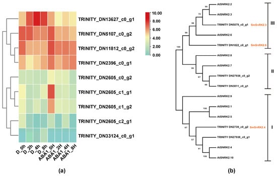 Drought stress can induce the increase in ABA, and the increasing ABA can improve the drought tolerance of plants. To investigate the ABA-dependent genes, the expression patterns of the core components of ABA signaling perception and transmission, such as PYL/PYR/RCAR, PP2C and SnRK2, were investigated. According to the comprehensive annotation of six databases, 11 unigenes were annotated as ABA receptors (PYL/PYR/RCAR) in the drought transcriptome, of which 9 unigenes were also annotated as ABA receptors (Table S2). Analysis of expression patterns in drought and ABA databases showed that TRINITY_DN13627_c0_g1, TRINITY_DN5107_c0_g2, TRINITY_DN11812_c0_g2 and TRINITY_DN2396_c0_g1 significantly responded to both drought and ABA (Figure 7a). Nine unigenes were screened to be annotated as SnRK2 family members. After the removal of the three short sequences, the phylogenetic tree of SnRK2 with 10 Arabidopsis thaliana SnRK2s showed that TRINITY_DN5079_c0_g1 (SmSnRK2.3) and TRINITY_DN1822_c0_g1 (SmSnRK2.6) belonged to SnRKIII subfamily, TRINITY_DN27938_c0_g2 and TRINITY_DN3811_c0_g1 belonged to SnRKII subfamily, which were activated by ABA (Figure 7b).