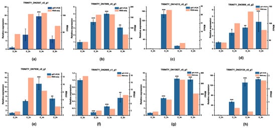 RSEM was used to quantify gene abundances. Essentially, differential expression analysis was performed using DESeq2 (http://bioconductor.org/packages/stats/bioc/DESeq2/, accessed on 25 August 2022) or DEGseq (https://www.rdocumentation.org/packages/DEGseq/versions/1.26.0, accessed on 25 August 2022). Unigenes with |log2FC| ≥ 1 and FDR ≤ 0.05 (DESeq2) or FDR ≤ 0.001 (DEGseq) were considered to be DEGs. Furthermore, functional enrichment analyses were conducted to identify DEGs significantly enriched in specific GO terms and metabolic pathways, which were performed with a significance threshold of p-adjust ≤ 0.05 when compared to the whole transcriptome background.