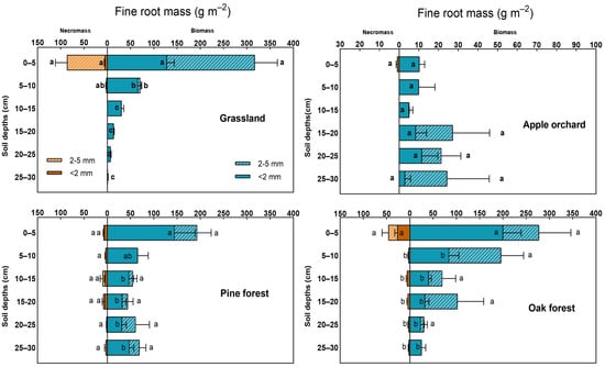 2.4. Vertical Distribution of Fine-Root Biomass and Necromass in Four Land-Use Types