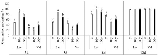 The percentages of seed germination in L. sativa (Lac) and V. locusta (Val) for control (C, white), 1 Gy (light grey), and 10 Gy (black) IR treatments. The bar charts represent the average percentages of seed germination, and the error bars represent the standard deviations. Different letters indicate significant differences according to Tukey’s test (p < 0.05).