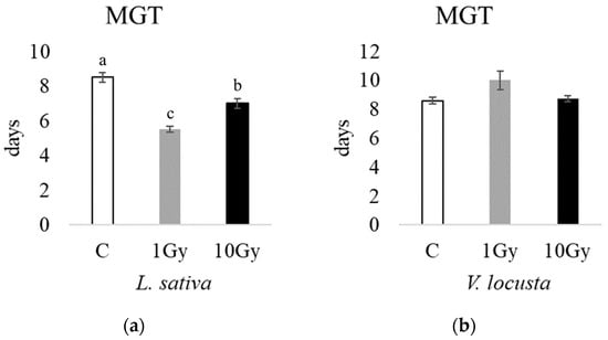 The mean germination times (MGTs) of L. sativa (a) and V. locusta (b) for control (C, white), 1 Gy (light grey), and 10 Gy (black) IR treatments. The bar charts represent the average MGTs, and the error bars the standard deviations. Different letters indicate significant differences according to Tukey’s test (p < 0.05).