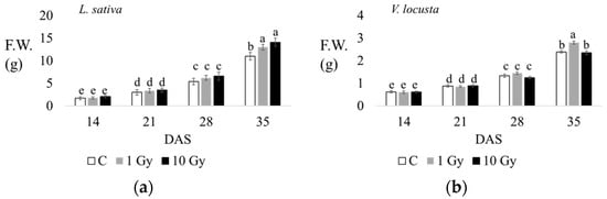 The fresh weight of aerial parts (g) of L. sativa (a) and V. locusta (b) for control (C, white), 1 Gy (grey), and 10 Gy (black) IR treatments at 14, 21, 28, and 35 days after sowing (DAS). The bar charts and each point of the trend time sub-figure show the average values, and the error bars represent the standard deviations. Different letters indicate significant differences according to Tukey’s test (p < 0.05).