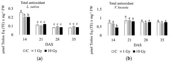 Total antioxidant content measured at 14, 21, 28, and 35 days after sowing (DAS) in L. sativa (a) and V. locusta (b) for control (C), 1 Gy, and 10 Gy IR treatments. The bar charts and each point of the trend time sub-figure represent the average values, and the error bars represent the standard deviations. Different letters indicate significant differences according to Tukey’s test (p < 0.05).