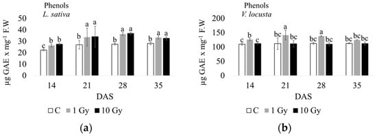 Phenol content measured at 14, 21, 28, and 35 days after sowing (DAS) in L. sativa (a) and V. locusta (b) for control (C), 1 Gy, and 10 Gy IR treatments. The bar charts and each point of the trend time sub-figure represent the average values, and the error bars represent the standard deviations. Different letters indicate significant differences according to Tukey’s test (p < 0.05).