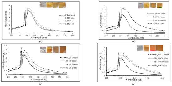 It has been documented that the reduction of silver ions results in a characteristic color change in the aqueous medium due to the excitation of the surface plasmon resonance (SPR) on the synthesized particles [42]. In this study, the addition of silver AgNO3 to the experimental plant extracts produced a wide range of color changes (Figure 1a–f insets). Leaf Rt extracts changed from a bright golden color to a cloudy yellow. Correspondingly, leaf 80 °C extracts displayed a similar color change, with greater intensity after the 1 h incubation period. The stem-bark extracts changed from a bright golden color to a cloudy brownish hue, with the change being more prominent in the 80 °C extracts. The fruit extracts changed from a faint pink to a dull ash color. Overall, different extracts produced different colors, signifying the varying reduction of Ag+ to Ag.