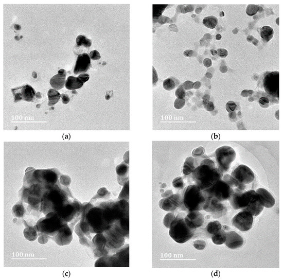 The NTA data showed a much larger size for AgNPs than did the HR-TEM analysis (Table 1). The disparity in the results may be due to the lower sensitivity of NTA; this method may have detected nanoparticles that were close to each other as larger particles [55]. Nanoparticles with a ζ-potential higher than +30 mV or lower than −30 mV [57] likely have sufficient repulsive force between the charged particles to attain better colloidal stability [58]. Conversely, a low zeta potential suggests particle aggregation and flocculation due to the van der Waals attractive forces that act upon the nanoparticles [59]. In the present study, all samples yielded a ζ-potential that ranged from −12.8–7.3 mV, indicating that AgNPs may incline towards lower stability and may have a greater tendency to aggregate. However, Joseph and Singhvi [58] stated that along with ζ-potential, other variables, such as material properties, presence of surfactants, and the solution chemistry, also influence the physical stability of the obtained nanosuspension. Their work suggests that zeta potential is not an absolute measurement of nanoparticle stability [60].