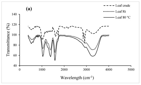 The FTIR absorption spectra of extracts before and after the reduction of Ag+ ions are presented in (Figure 5a–c). Absorption peaks in the 3600–3000 cm−1 range were observed for all biosynthesized AgNPs. These bands are characteristic of stretching vibrations of the O-H functional group in carboxylic acid and N-H stretching vibrations of amines in amino acids, peptides, and proteins [61,62]. Previous studies have indicated that hydroxyl groups serve as reducing agents and that carboxyl groups support the size and shape of nanoparticles [33,43]. New spectral peaks were observed at 1586.42, 1585.8, 1582.5, and 1582.73 cm−1 in leaf Rt and 80 °C AgNPs spectra, as well as in fruit Rt and 80 °C AgNPs spectra. This result could be attributed to the amide II N-H bending vibration coupled with C-N stretching at 1044.58, 1042.89, 1046.76, and 1045.23 cm−1 [63]. These absorption bands may indicate that proteins were interacting with the AgNPs [35]. Peak shifts were also noted at wavelengths of 1610.71 and 1606 cm−1 in the stem-bark Rt and 80 °C AgNPs. This could be attributed to a quinone compound, which has been shown to be responsible for the reduction of AgNO3 and for particle size [64].