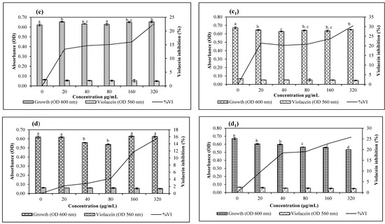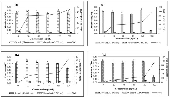 In this assay, 100 μL of the tested Chromobacterium spp. strains were cultured in 3 mL of LB medium and incubated at 30 °C with increasing concentrations of each AgNPs extract at 0, 20, 40, 80, 160, and 320 μg/mL. Bacterial growth (optical density (OD)600 nm) and violacein production (OD560 nm) were determined following an overnight incubation. One mL of the treated and untreated overnight cultures of Chromobacterium were centrifuged (Labnet Prism Microcentrifuge) at 10,000 rpm for 10 min to precipitate insoluble violacein. The pellet was resuspended in 1 mL of DMSO [37,38], centrifuged (10,000 rpm for 10 min), and quantified at OD560 nm. The following formula was used to calculate percentage of violacein inhibition (VI) [39,41].
