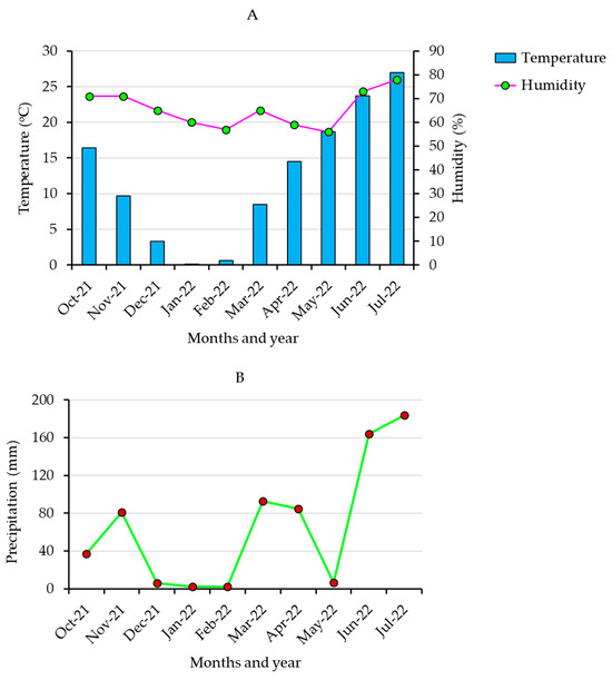 Monthly average temperature and humidity (A) and precipitation (B) during the growing period in the cultivation area.