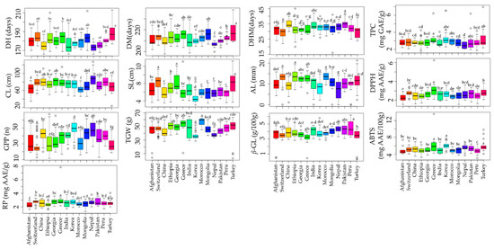 Effect of origin on agronomical traits and biochemical traits in barley accessions grown in Korea. Different letters on boxplots indicate significantly different means based on Duncan’s multiple range test (p < 0.05). ABTS: ABTS•+ scavenging activity, AL: Awn length, CL: Culm length, DH: Days to heading, DM: days to maturity, DHM: Days from heading to maturity, DPPH: DPPH• scavenging activity, GPP: Number of grains per panicle, RP: Reducing power, SL: Spike length, TGW: One-thousand grains weight, TPC: Total phenolic content, β-GL: β-glucan content.