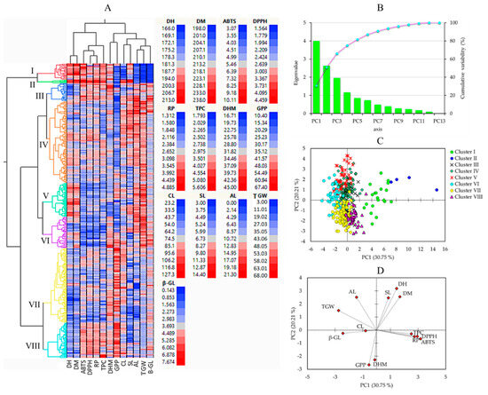Multivariate statistical tools, including HCA, PCA, and correlation analysis, aid in comprehending the diversity of plant resources and examining the interaction between phenotypic traits [21,51]. In this study, HCA and PCA were computed using the entire quantitative dataset (Figure 3). The HCA clustered the barley genotypes into eight clusters (Figure 3A).
