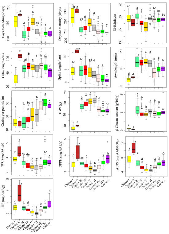 Boxplots showing the variations of quantitative traits across barley accession clusters and compared to the control cultivars. Different letters on boxplots indicate significantly different means based on Duncan’s multiple range test (p < 0.05). ABTS: ABTS•+ scavenging activity, AL: Awn length, CL: Culm length, DH: Days to heading, DM: Days to maturity, DHM: Days from heading to maturity, DPPH: DPPH• scavenging activity, GPP: Number of grains per panicle, RP: Reducing power, SL: Spike length, TGW: One-thousand-grain weight, TPC: Total phenolic content, β-GL: β-glucan content.