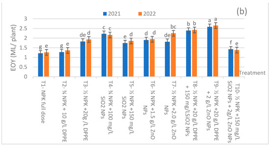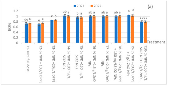 (a) Essential oil % as affected by the used applications (average: two cuts) during the 2021 and 2022 seasons. (b) Essential oil yield/plant as affected by the used applications (average: two cuts) during the 2021 and 2022 seasons. Means with the same letters within the figure are not significantly different (p ≤ 0.05) according to DMRT.