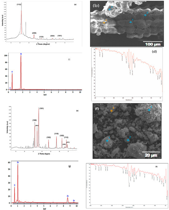 (a) XRD of SiO2 NPs; (b) SEM of SiO2 NPs; (c) ADX of SiO2 NPs; (d) FTIR of SiO2 NPs; (e) XRD of ZnO NPs; (f) SEM of ZnO NPs; (g) ADX of ZnO NPs; and (h) FTIR of ZnO NPs. 1—Fourier-transform infrared (FTIR) absorption spectroscopy was used to evaluate the chemical bonding nature of the nanoparticles. 2—Scanning electron microscopy (SEM) was used to examine the morphology and elemental composition of the powder as it was removed [92]. 3—X-ray diffraction (XRD) is a technique for characterizing crystalline materials. It provides information on structures, phases, preferred crystal orientations (texture), and other structural parameters, such as average grain size, crystallinity, strain, and crystal defects [93]. 4—Energy-dispersive X-ray spectroscopy (EDX) is a technique of elemental analysis associated with electron microscopy based on the generation of characteristic X-rays that reveals the presence of elements present in the specimens [94].