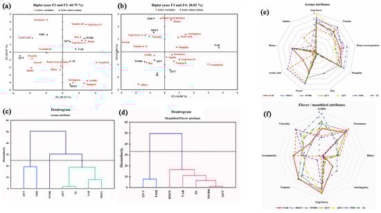The principal component analysis, hierarchical clustering analysis of sensory attribute, and sensory profile analysis of goji berry pulp. (a) PC1 and PC2 of the principal component analysis for attributes of goji berry pulp (in Goji berry −A and Tomato −A, the ‘A’ stands for the abbreviation of aroma, in Goji berry −F and Tomato −F, the ‘F’ stands for the abbreviation of flavor); (b) PC3 and PC4 of the principal component analysis for attributes of goji berry pulp, (black font indicates samples, red font indicates sensory attributes); (c) clustering diagram for aroma attributes (different colors represent different aroma categories); (d) clustering diagram for mouthfeel/flavor attributes (different colors represent different flavor /mouthfeel categories); (e) goji berry pulp aroma profile chart; (f) goji berry pulp flavor/mouthfeel profile chart(spider web of sensory profile analysis of goji berry pulp based on cluster analysis).