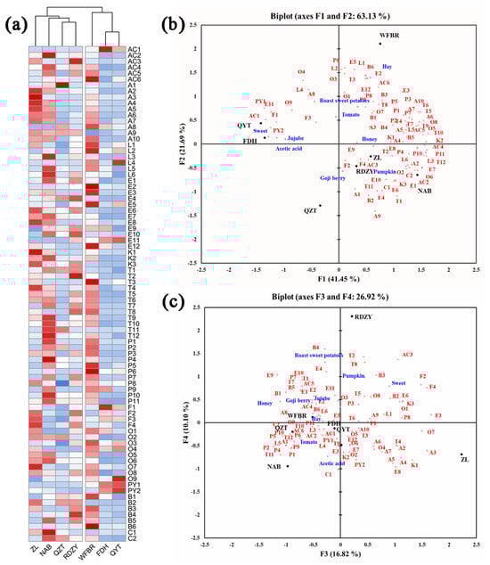 The PCA results showed that QYT and FDH exhibit “sweet”, “jujube”, and “acetic acid” attributes. These attributes could be associated with compounds such as 2,3-dimethyl-5-ethylpyrazine (PY1), acetylpyrazine (PY2), phenylethyl alcohol (O9), butyric acid (AC1), furfural (F1), benzeneacetic acid, and ethyl ester (E11). ZL and RDZY exhibited “goji berry” and “honey” attributes. These attributes could be associated with compounds such as hexanal (A1), 2-acetylfuran (F2), furfuryl alcohol (F4), 2-ethylhexanoic acid (AC3), 2-hydroxy-4-methyl ethyl valerate (E9), octanal (A3), o-cymene (B4), 1-octen-3-one (K1), and terpinolene (T2). NAB exhibited the “pumpkin” attribute. This attribute could be associated with compounds such as caprylic acid methyl ester (E6), damascenone (C1), 2-nonanone (K3), 1-pentanol (O2), trans-2-hexenal (A2), and δ-dodecalactone (L6). WFBR exhibits a “hay” attribute, which could be associated with compounds such as δ-hexalactone (L1), 2-phenoxyethanol (B6), amyl acetate (E2), trans-rose oxide (T3), and benzoic acid (AC6). “Sweet potatoes” and “tomatoes” were likely to be associated with o-xylene (B1), 2-methyl-1-propanol (O1), (E,Z)-2,6-nonadienal (A8), 5-methyl furfural (F3), 3-ethylphenol (P9), 4-ethylphenol (P8), and palmitic acid ethyl ester (E12).