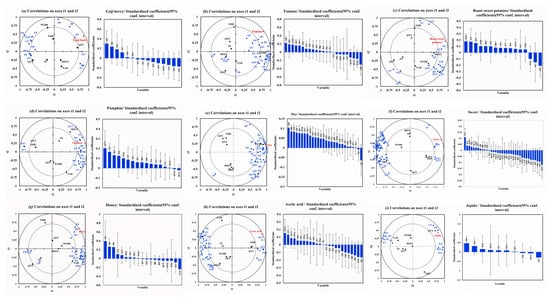 PLSR analysis of aroma attribute and volatile aroma compounds. (a) PLSR analysis of “goji berry aroma” and volatile aroma compounds. (“*” Indicates compound OAV > 1) (b) PLSR analysis of “tomato aroma” and volatile aroma compounds (“*” indicates compound OAV > 1). (c) PLSR analysis of “roast sweet potatoes aroma” and volatile aroma compounds (“*” Indicates compound OAV > 1). (d) PLSR analysis of “pumpkin aroma” and volatile aroma compounds. (e) PLSR analysis of “hay aroma” and volatile aroma compounds (“*” indicates compound OAV > 1). (f) PLSR analysis of “sweet aroma” and volatile aroma compounds (“*” indicates compound OAV > 1). (g) PLSR analysis of “honey aroma” and volatile aroma compounds (“*” indicates compound OAV > 1). (h) PLSR analysis of “acetic acid aroma” and volatile aroma compounds (“*” indicates compound OAV > 1). (i) PLSR analysis of “jujube aroma” and volatile aroma compounds (“*” indicates compound OAV > 1). Red indicates aroma attributes, blue indicates aroma compounds.