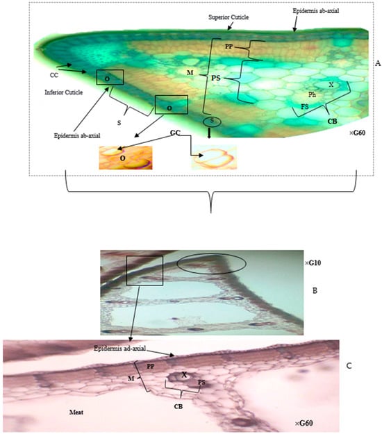 Paradermal sections of T. latifolia leaves (Witness) (A–C). CB: Conducting Bundles; CC: Companion Cells; FS: Fascicular Sheath; GC: Guard Cell; M: Mesophyll; S: Stomata; PS: Parenchyma of Spongy; PP: Palisade Parenchyma; O: Ostiole; Ph: Phloem; X: Xylem.