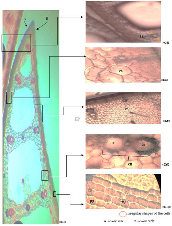 Paradermal sections of T. latifolia leaves (under wastewater stress). S: Stomata; PS: Parenchyma of Spongy; PP: Palisade Parenchyma; CB: Conducting Bundles; Ph: Phloem; X: Xylem.