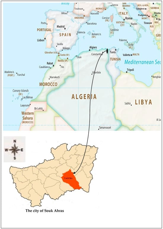- Available online: http://timein.org/algeria/souk-ahras/map (accessed on 6 June 2023).