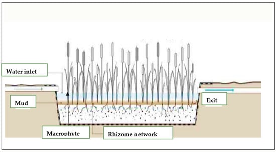 Figure 5 presents a schematic illustration of the treatment processes within a constructed wetland. As wastewater traverses the wetland, it undergoes a series of physical, chemical, and biological transformations that effectively remove pollutants. Notably, sedimentation, filtration, and microbiological degradation serve as the primary mechanisms involved. These processes efficiently eliminate ammonia, suspended solids, and various organisms. Additionally, nitrogen removal demonstrates high efficiency, while phosphorus removal exhibits less efficacy. Constructed wetlands are extensively employed in the tertiary treatment of both municipal wastewater and stormwater runoff.