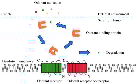 Odor molecules enter the receptor lymphatic fluid through micropores in the olfactory sensory epidermis. However, hydrophobic odorants cannot cross the hydrophilic lymphatic fluid to reach the odorant receptor neuron (ORN) and must be carried by a transport protein. These odorant-transporting proteins fall into two categories known as odorant-binding proteins (OBPs) or chemosensory proteins (CSPs) [10]. After being wrapped by a transport protein in the lymphatic fluid to form a complex, the odorant is transported to the ORN and activates the odorant receptors (ORs), ionotropic receptors (IRs), or sensory neuron membrane proteins (SNMPs) on the dendritic membrane. Subsequent excitation of the olfactory neurons is induced, converting chemical signals into electrical signals, which are transmitted as action potentials to higher nerve centers (i.e., antennal lobes and mushroom bodies). Finally, the higher nerve centers integrate the electrical signals and release nerve impulses that direct the insect to produce specific physiological and behavioral responses (Figure 2) [10,42,43].