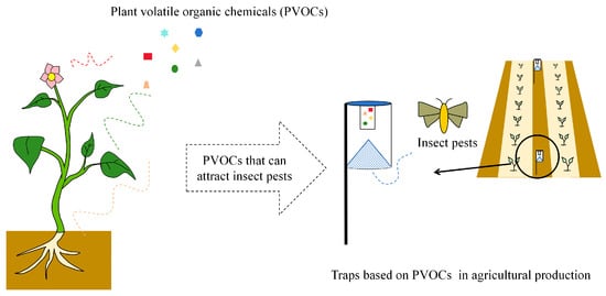 Through long-term coevolution, insects and plants have formed a close relationship. For example, volatiles released by plant floral organs can attract a variety of lepidopteran adults, which plants require for gene exchange, while most lepidopteran adults also need to feed on plant nectar to obtain required nutrients [73]. Leveraging this close relationship provides an effective way to develop attractants by studying the effects of PVOCs on insect behavior and then screening components with high behavioral activity levels against pests.
