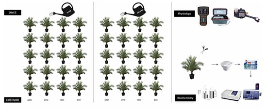 (Figure 1). Sodium chloride (NaCl) was incrementally introduced over a span of 15 consecutive days utilizing a series of dilutions with varying concentrations (25%: 38.5 mM, 50%: 77.1 mM, 75%: 115.6 mM, and 100%: 154 mM) in order to mitigate the occurrence of osmotic shock. Salt-treated batches were irrigated twice a week with a solution of tap water containing 154 mM NaCl, with a volume of 500 mL per application. On the other hand, control lots received tap water only. After 3 months, evaluations of both phenotypic and physiological characteristics were conducted. Leaves were then harvested, and biochemical analyses were performed (Figure 1).