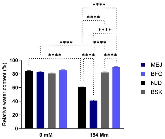 Additionally, a notable decrease in the relative water content (expressed as a percentage) was noted, with the exception of the Boufeggous and Bouskri genotypes, as illustrated in Figure 4. The observed differences in this response among the four cultivars were statistically significant (p < 0.0001) under the conditions of salt stress. Based on this significant impact, the genotypes were classified into two distinct categories. The first category consisted of two genotypes, Mejhoul and Nejda, which displayed reductions in relative water content of 50.8% and 27.47%, respectively, when compared to the control batches. In contrast, the genotypes belonging to the second category, namely Boufeggous and Bouskri, did not exhibit any significant reductions in this specific parameter.