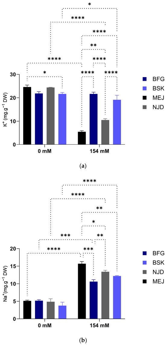 Specifically, the Na+/K+ ratio in the Mejhoul cultivar experienced a dramatic increase from 0.19 to 2.87 (a 15-fold increase) under salt stress conditions. On the other hand, the Boufeggous cultivar demonstrated only a slight increase in the Na+/K+ ratio of 2.52 times (Figure 5).