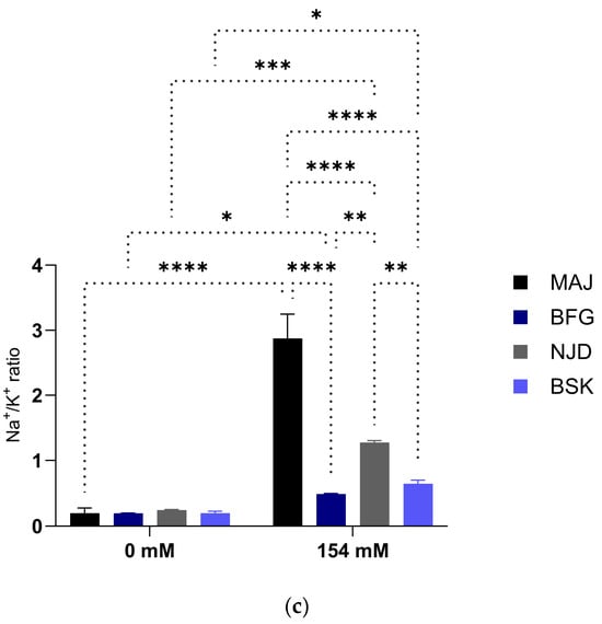 Impact of salinity treatment on Na+, K+, and Na+/K+ ratio in the leaves of four Moroccan date palm cultivars grown under normal (0 mM NaCl) and saline (154 mM NaCl) conditions. (a) Effect of salt treatment on K+ contents; (b) effect of salt treatment on Na+ contents; and (c) effect of salt treatment on Na+/K+ ratio. Means were separated using Tukey’s test at p ≤ 0.05. Bars represent mean ± SE (n = 3). Significant (p ≤ 0.05) differences are marked with asterisks. * Significant difference at p < 0.05; ** significant difference at p < 0.005; *** significant difference at p < 0.001; and **** significant difference at p < 0.0001.