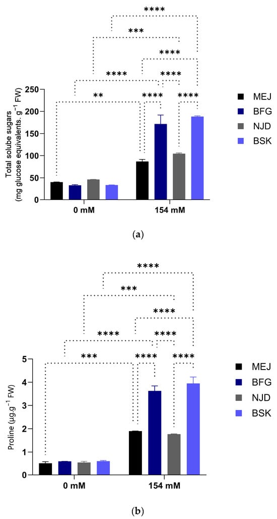 Notably, the Bouskri cultivar exhibited the highest proline accumulation, with a value of 3.94 µg.g−1 FW (a six-fold increase compared with the control). Conversely, the Mejhoul plants exposed to 154 mM NaCl demonstrated the lowest proline accumulation, with a three-fold concentration relative to the control (Figure 6).