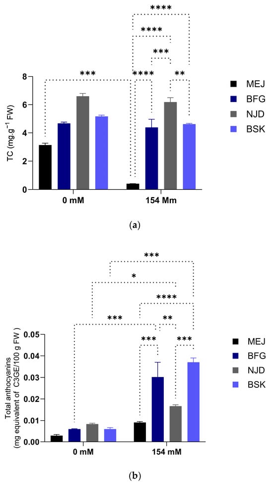 The accumulations of TC and TA among the four cultivars after three months of salt stress exposure are presented in Figure 7. It is evident that the stress condition contributed to a decrease in TC in all cultivars, with the most pronounced decrease observed in the Mejhoul cultivar (86%) under the 154 mM NaCl condition.
