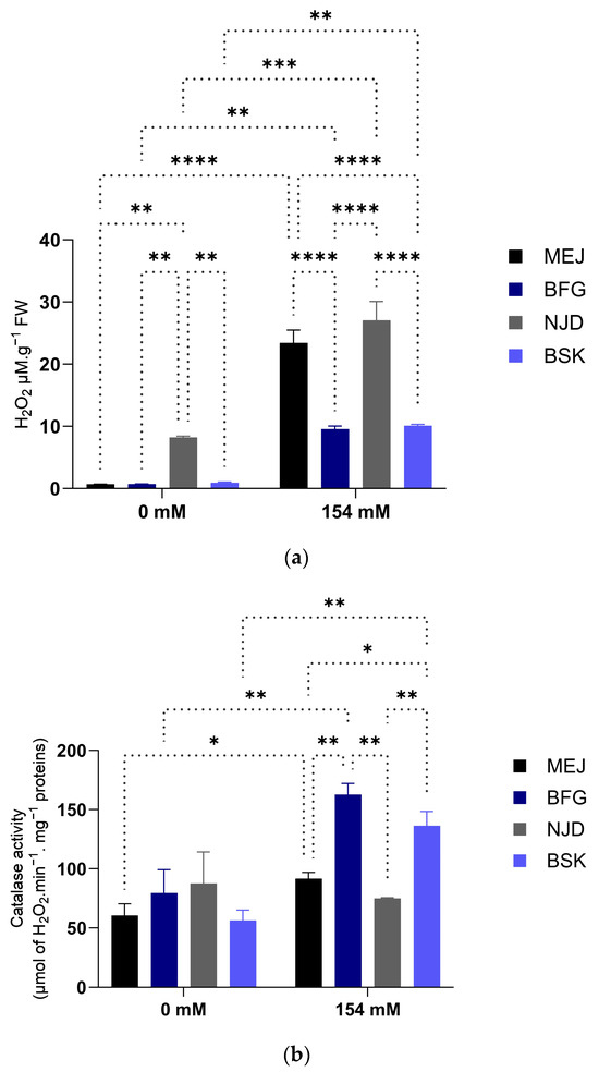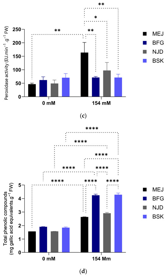 Influence of salt stress on H2O2 contents, catalase activity, peroxidase activity, and phenolic compounds in the leaves of four Moroccan date palm (Phoenix dactylifera L.) cultivars. (a) Effect of salt treatment on H2O2 contents; (b) effect of salt treatment on catalase activity; (c) effect of salt treatment on peroxidase activity; and (d) effect of salt treatment on total phenolic compounds. Means were separated using Tukey’s test at p ≤ 0.05. Bars represent mean ± SE (n = 3). Significant (p ≤ 0.05) differences are marked with asterisks. * Significant difference at p < 0.05; ** significant difference at p < 0.005; *** significant difference at p < 0.001; and **** significant difference at p < 0.0001.