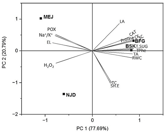 - Sivakumar, J.; Sridhar Reddy, M.; Sergeant, K.; Hausman, J.F.; ShaValli Khan, P.S.; Osman Basha, P. Principal component analysis-assisted screening and selection of salt-tolerant tomato genotypes. Plant Physiol. Rep. 2023, 28, 272–288. [Google Scholar] [CrossRef]