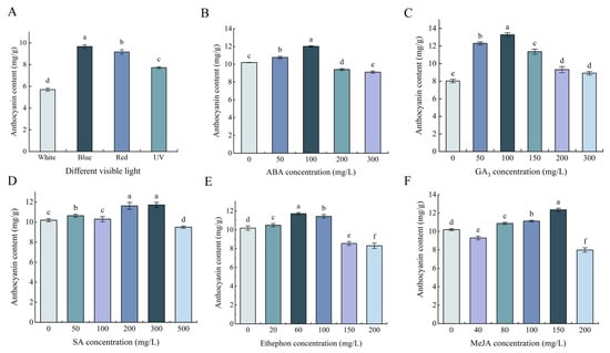 Effects of different treatments on anthocyanin content in tea plant leaves. (A): The change in anthocyanin content following irradiation with blue, UV, or red light. (B–F): Effects on anthocyanin content of different concentrations of ABA, GA3, SA, ethephon, and MeJA, respectively. Different small letters indicate significant differences at p < 0.05, and the same below.