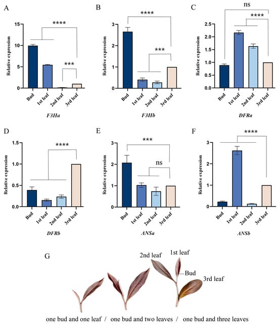Relative expression of the genes in the anthocyanin synthesis pathway of tea plant leaves. (A–F): The relative expression of F3Ha, F3Hb, DFRa, DFRb, ANSa, and ANSb genes, respectively. (G): Schematic drawing of one bud and one leaf, one bud and two leaves, and one bud and three leaves. Note: the bar chart shows the mean of the three biological replicates, and the error bars are standard deviations, and the asterisks indicate statistical difference in one-way analysis of variance (ns p < 0.1234, *** p < 0.0002, **** p < 0.0001).