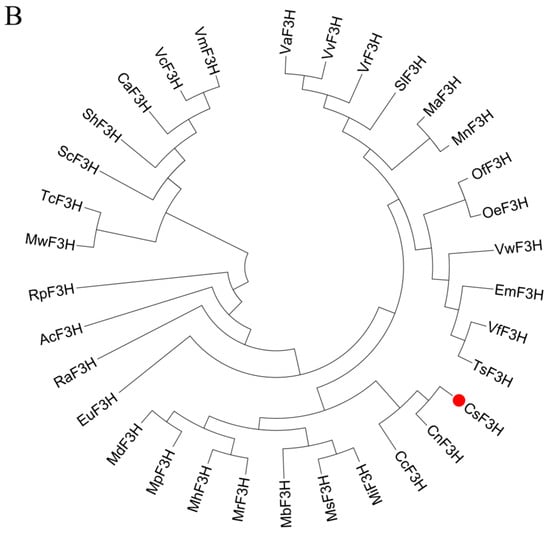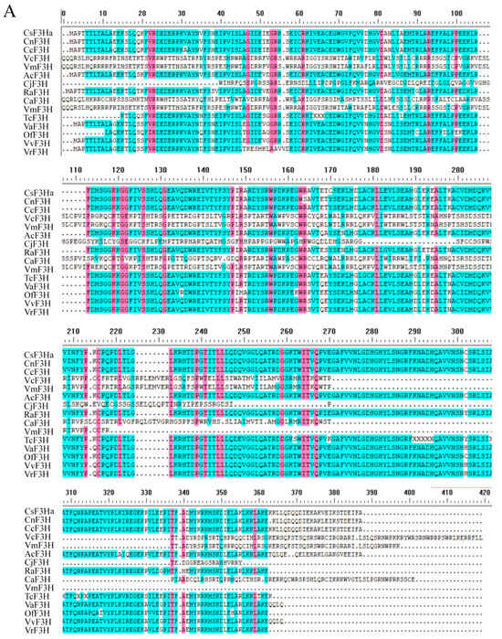 Multiple alignment of CsF3H protein and phylogenetic tree analysis of CsF3Ha. (A): Multiple alignment of CsF3H protein from other plants. (B): Phylogenetic tree analysis of CsF3H among multitudinous horticultural herbaceous and woody plants. CsF3Ha was highlighted with the red dot in the phylogenetic tree. Note: VaF3H (KP966099.1, Vitis amurensis), VvF3H (NM001281105.1, Vitis vinifera), VrF3H (KF040970.1, Vitis rotundifolia), SlF3H (KT954907.1, Silene littorea), MaF3H (ON055162.1, Morus alba), MnF3H (KF438044.1, Morus notabilis), OfF3H (MT495418.1, Osmanthus fragrans), OeF3H (XM023028959.1, Olea europaea), VwF3H (KJ463622.1, Viola wittrockiana), EmF3H (MW767838.1, Euphorbia maculata), VfF3H (KY656685.1, Vernicia fordii), TsF3H (MN906942.1, Triadica sebifera), CsF3Ha (MT355076, Camellia sinensis), CnF3H (HQ290517.1, Camellia nitidissima), CcF3H (HQ290517.1, Camellia nitidissima), MiF3H (KF513568.1, Meconopsis integrifolia), MsF3H (KF513571.1, Meconopsis simplicifolia), MbF3H (KF513559.1, Meconopsis betonicifolia), MrF3H (KF513570.1, Meconopsis racemosa), MhF3H (KF513566.1, Meconopsis horridula), MpF3H (KF513569.1, Meconopsis pseudohorridula), MdF3H (KF513565.1, Meconopsis delavayi), EuF3H (OK648437.1, Erythronium umbilicatum), RaF3H (OP018672.1, Rhododendron agastum), AcF3H (FJ542819.1, Actinidia chinensis), RpF3H (AB289594.1, Rhododendron pulchrum), MwF3H (MW373502.1, Meconopsis wilsonii), TcF3H (KU551927.1, Thesium chinense), ScF3H (AY332537.1, Sinningia cardinalis), ShF3H (LC322157.1, Saintpaulia hybrid), CaF3H (KY348830.1, Camptotheca acuminata), VcF3H (MH321462.1, Vaccinium corymbosum), VmF3H (MZ926696.1, Vaccinium myrtillus).