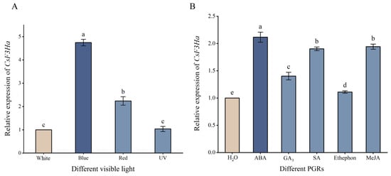 CsF3Ha expression significantly (p < 0.05) differed under visible light conditions (Figure 4A). Concurrently, CsF3Ha expression in one bud and two leaves of tea plants subjected to different visible light was significantly (p < 0.05) higher than under white light, following the order of blue, red, UV, and white light, with its expression being insignificant under UV light and the highest under blue light. Furthermore, CsF3Ha expression under different PGRs was significantly (p < 0.05) higher than that under H2O, following the order of ABA, SA, MeJA, GA3, ethephon, H2O, with it being the highest under ABA (Figure 4B).