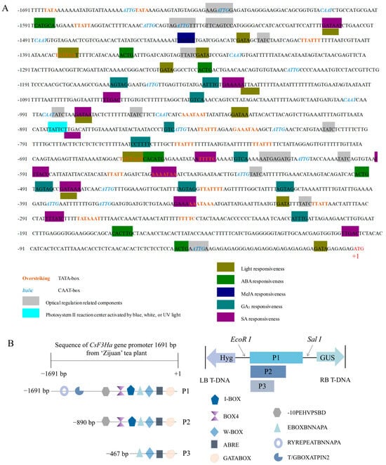 Anthocyanin susceptibility to pH, light, PGRs, temperatures, and metal ions, among other abiotic factors, is well-established. While the genetic background primarily determines the occurrence of specific anthocyanins in plants, environmental factors can variably affect the concentration of these compounds [12,13]. In CsF3H transgenic Arabidopsis thaliana seeds, a significant increase in flavonol glycosides and oligomeric proanthocyanidins was observed, accompanied by a decrease in monocatechin derivatives [14]. Research demonstrated significant induction of CsF3H genes under different abiotic stresses, including UV light radiation, sucrose, and ABA [14]. However, limited reports exist on the effects of environmental and biological factors on the promoters of different structural genes. The factors responsible for increased anthocyanin content remain largely unexplored. Studies on the CsF3H promoter in Camellia sinensis need further research. To elucidate the regulation of F3H expression, identifying promoter sequences interacting with regulatory proteins is crucial. In this study, we aim to clone the CsF3Ha gene and its promoter from the ‘Zijuan’ tea plant, predicting promoter-acting elements. Agrobacterium-mediated techniques were used to study different promoter segments’ activity. The investigation seeks to unveil the primary induction factors regulating anthocyanin content, offering insights for subsequent exploration of transcription factors associated with this gene.