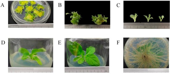 Transgenic tobacco in the media with hygromycin resistance. (A): Differentiated adventitious buds from the tobacco callus were screened for culture on 15th day. (B): Adventitious bud of hygromycin-resistant tobacco. (C): Adventitious buds cut from the callus. (D): Adventitious buds after 30 days. (E): Adventitious buds were induced during rooting. (F): Root of transgenic tobacco.