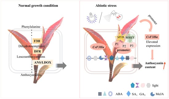 In this study, the CsF3Ha promoter regions of P1, P2, and P3 were fused to the GUS reporter gene, and many cis-elements were predicted. We observed a significant induction of the CsF3Ha promoter by SA and blue light under diverse abiotic stresses. Expression analysis of the CsF3Ha gene and anthocyanin content assay substantiated this observation. Thus, we speculated that transcription factors WRKY and MYB could bind CsF3Ha promoter motifs, enhancing its activity, initiating gene expression, and thereby inducing anthocyanin accumulation (Figure 8). This study elucidated the expression characteristics of the CsF3Ha promoter in tea plants, thus contributing to a deeper understanding of the complex regulatory mechanisms governing CsF3Ha expression in anthocyanin synthesis and accumulation. The functionally validated CsF3Ha promoter identified in this study stands as a promising candidate for genetic engineering to regulate anthocyanin synthesis and accumulation.