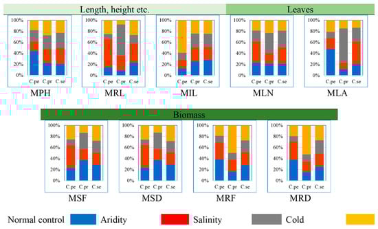 Proportion of morphological traits of three Cenchrus species under multiple abiotic stresses. Morphology: MPH—plant height (cm), MRL—root length (cm), MLN—number of leaves per plant, MIL—inflorescence length (cm), MSF—shoot fresh weight (g plant−1), MSD—shoot dry weight (g plant−1), MRF—root fresh weight (g plant−1), MRD—root dry weight (g plant−1), MLA—leaf area (cm2).