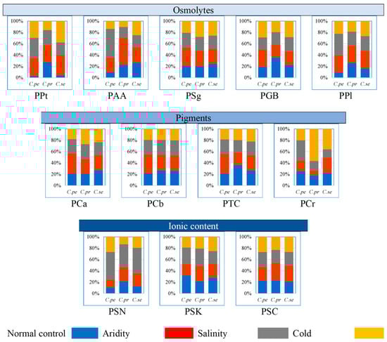 Proportion of physiological traits of three Cenchrus species under multiple abiotic stresses. Osmolytes: PPt—total soluble proteins (μg g−1 f w.), PAA—total free amino acids (μg g−1 f w.), PSg—total soluble sugars (mg g−1 d w.), PGB—glycine betaine (μmol g−1 f w.), PPl—proline (μmol g−1 f w.). Pigments: Pca—chlorophyll a (mg g−1 f w.), PCb—chlorophyll b (mg g−1 f w.), PCr—carotenoids (mg g−1 f w.). Ionic content: PTC—total chlorophyll (mg g−1 f w.), PSN—shoot Na+ (mg g−1 f.w.), PSK—shoot K+ (mg g−1 f.w.), PSC—shoot Ca2+ (mg g−1 f.w.).